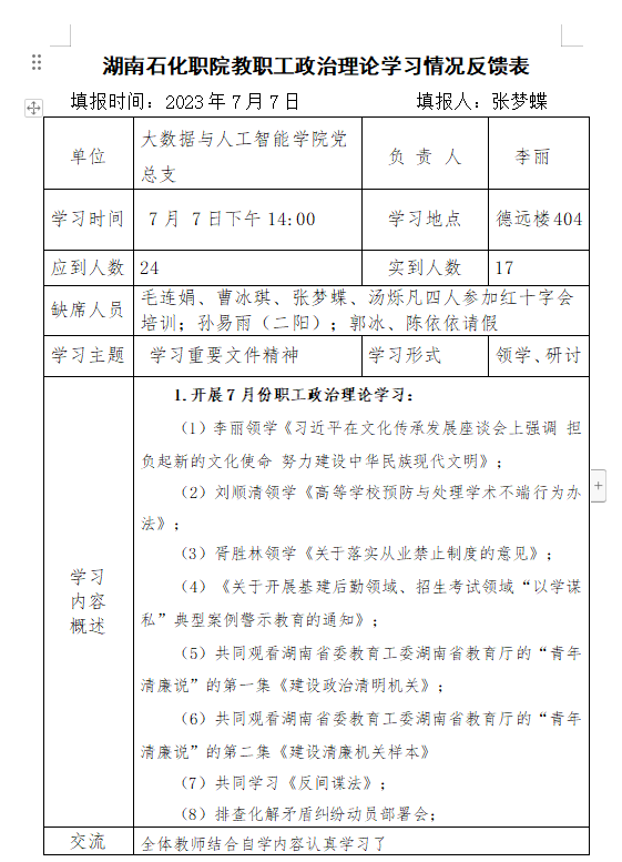 2023年7月中心组、教职工政治理论学习情况
