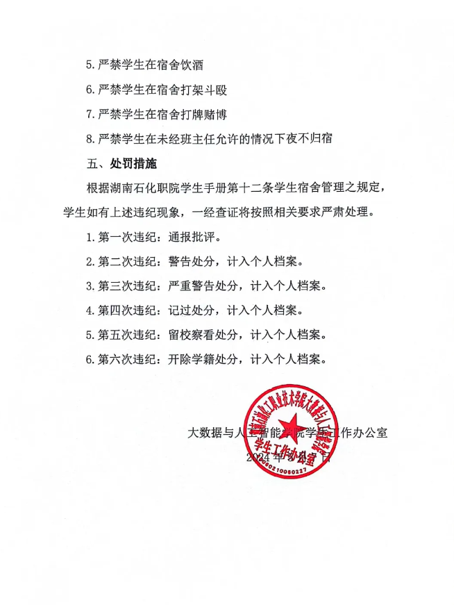 根据湖南石化职院学生手册第十二条学生宿舍管理之规定,学生如有上述违纪现象,一经查证将按照相关要求严肃处理。