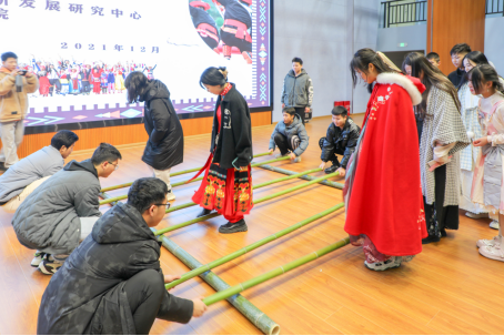 活动现场设置了民族味道、民族礼仪、民族舞蹈、民族之音、民族游戏、民族记忆、民族榜样等7个区域。其中,民族味道区摆放了青稞茶、波波糖、敲糖等民族特色美食;民族之音区向同学们教学民族语言、辨识民族乐器;民族舞蹈区,同学们一起跳起热烈的维族舞蹈。此外,还有踢苗毽、剪花纸、竹竿舞等各类富有民族特色的游戏。活动采用“闯关”模式,吸引了众多学生参与体验,大家在体验少数民族风俗的同时也收获了通关拿奖的喜悦。