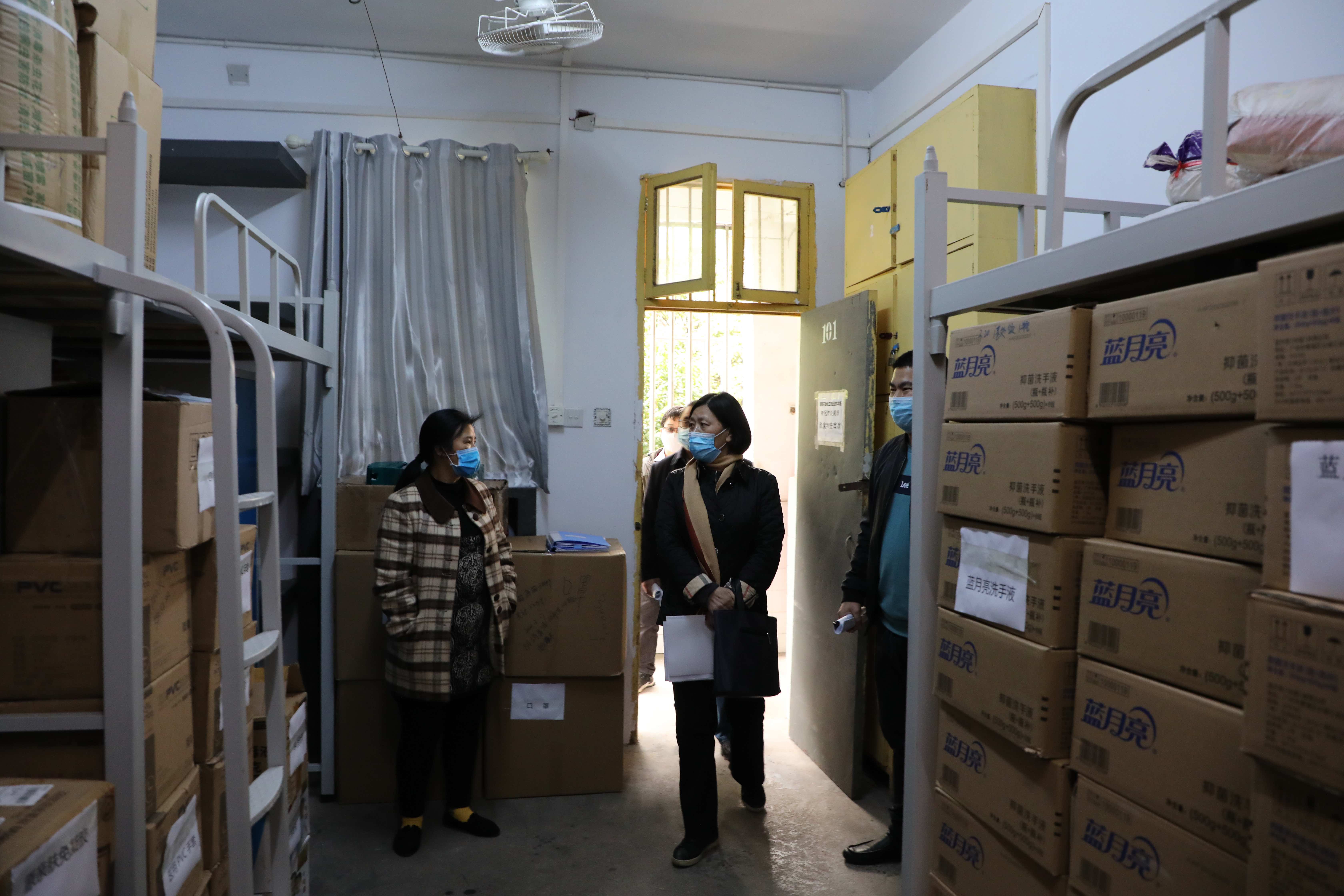 督察组(中)检查防疫物资储备情况