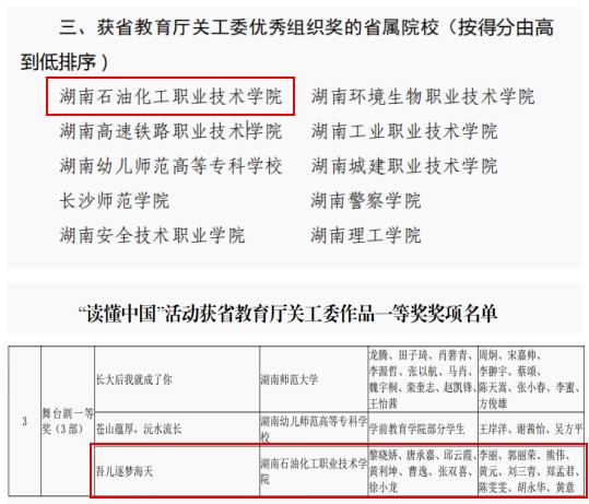 “读懂中国”活动由教育部关工委发起,省教育厅关工委承办。伟德官网《吾儿逐梦海天》荣获湖南省教育厅关工委舞台剧一等奖;《闪闪发光的突击队精神》荣获湖南省教育厅关工委微视频二等奖;《致敬最可爱的人——李和初》荣获湖南省教育厅关工委微视频二等奖;在湖南省教育厅关工委征文中,《“荒货大爷”的家国情怀》《忆往昔峥嵘岁月,共话百年新时代》均荣获二等奖,其中,由大数据与人工智能学院教师党支部与学生党支部报送的作品《吾儿逐梦海天》《传承红色基因,致敬崇高灵魂》连续两年荣获一等奖。
