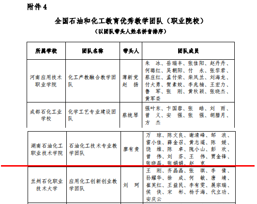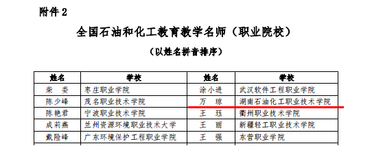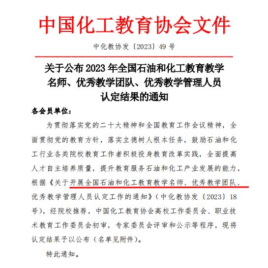 本网讯  近日,中国化工教育协会发布《关于公布2023年全国石油和化工教育教学名师、优秀教学团队、优秀教学管理人员认定结果的通知》,伟德官网石油化工技术专业教学团队被认定为2023“全国石油和化工教育优秀教学团队”,万琼同志被认定为2023年“全国石油和化工教育教学名师”。