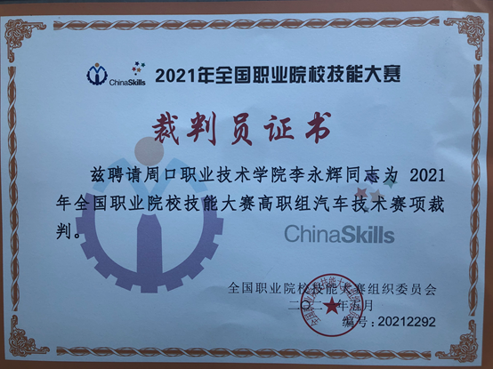 6月16日,2021年全国职业院校技能大赛高职组汽车技术赛项在山东交通职业学院举行。betway官网李永辉老师受邀参加了该项赛事比赛的裁判工作,这也是继2019年后李永辉老师再次执裁国家级赛事。