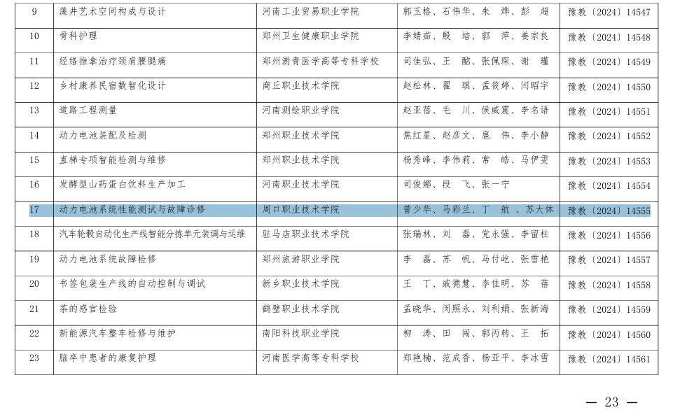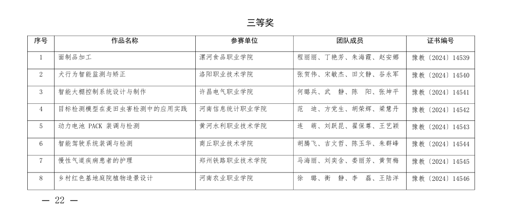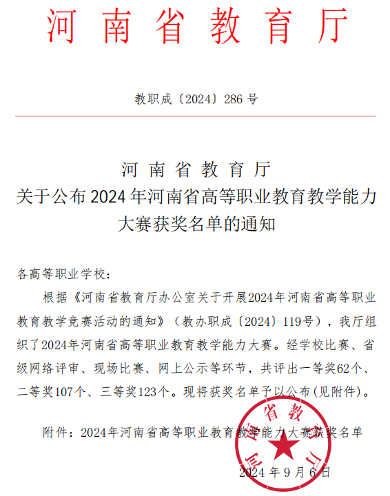 近日,河南省教育厅下发《关于公布2024年河南省高等职业教育教学能力大赛获奖名单的通知》(教职成〔2024〕286号),betway官网教师曾少华、马彩兰、丁航、苏大体团队的《动力电池系统性能测试与故障诊修》获得三等奖。