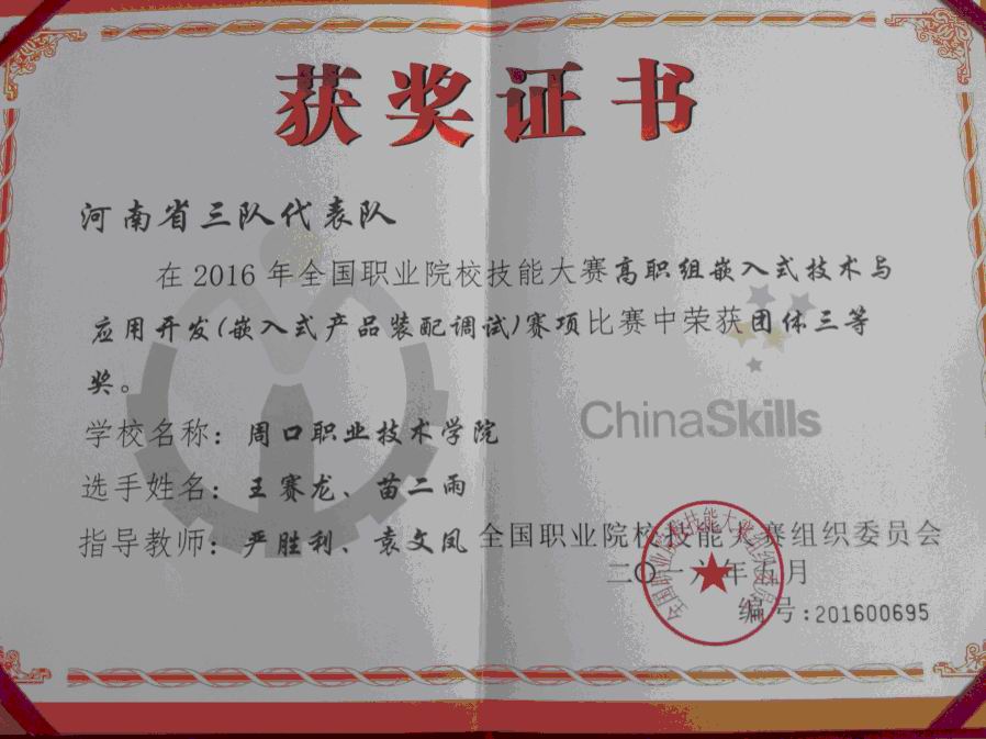 2016年全国职业技能大赛-嵌入式技术与应用开发项目荣获“三等奖”