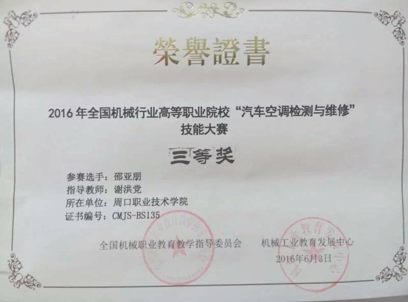 2016年汽车专业学生参加全国高职院校技能大赛荣获“三等奖”