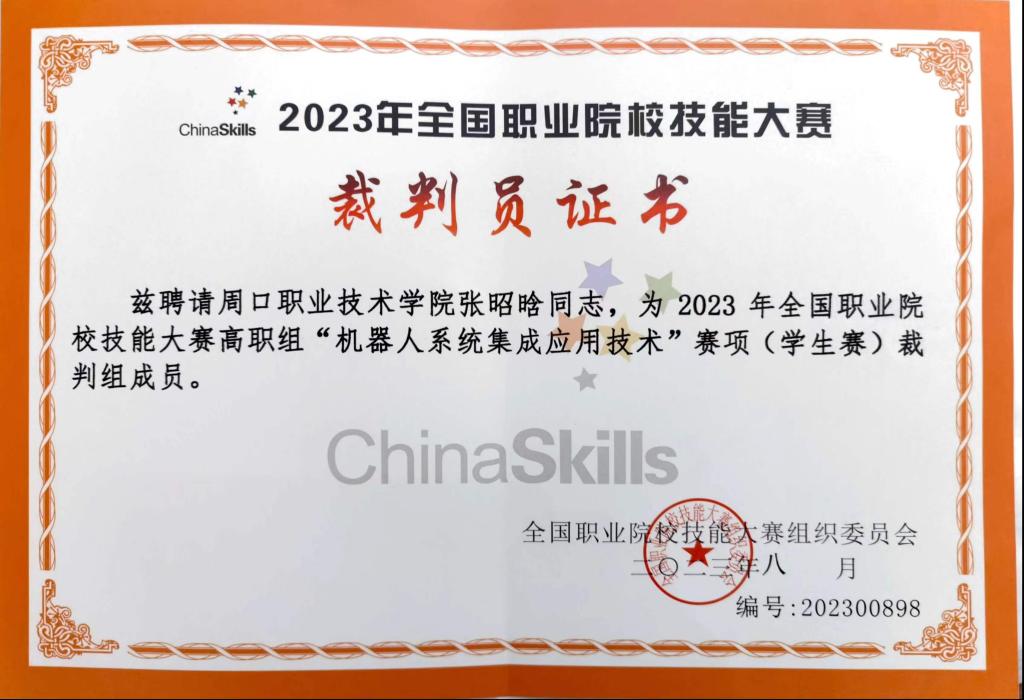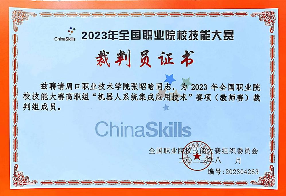 8月18-25日,根据《教育部关于举办2023年全国职业院校技能大赛的通知》(教职成函[2023]6号)精神,2023年全国职业院校技能大赛高职组“机器人系统集成应用技术”赛项,在山东省济南市山东职业学院举行,betway官网张昭晗老师受邀参加了该赛事“教师组”和“学生组”的裁判工作。