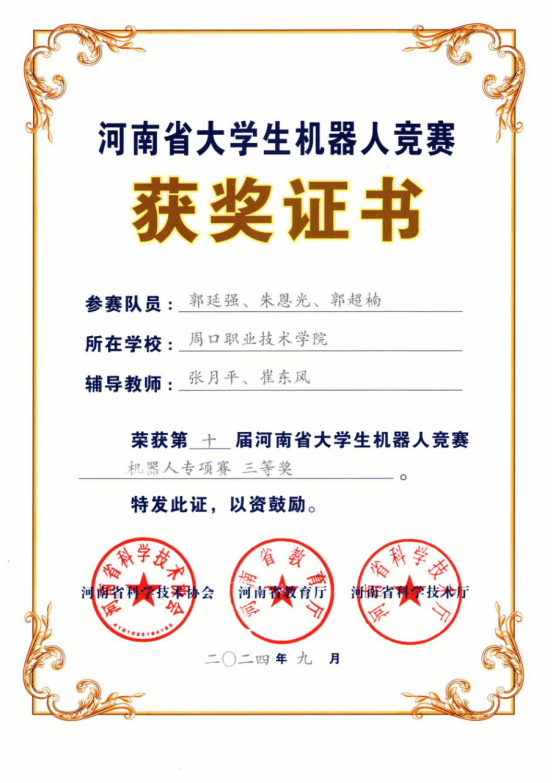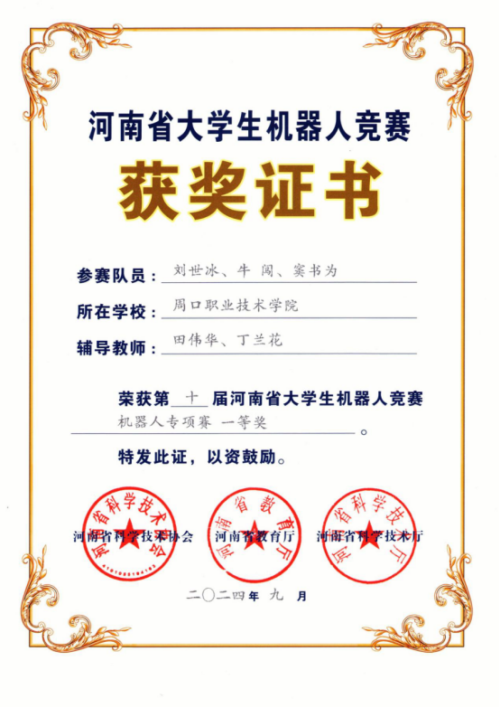 在学院领导的大力支持下,betway官网多支队伍以其优秀的表现在众多参赛队伍中脱颖而出,斩获一等奖4项,二等奖2项,三等奖1项。其中吕培源、刘庭、王杰(指导教师李向前、陈文静)参加“机器人舞蹈”,获得一等奖;刘勇奇、原彬淇、李奕霖团队(指导教师雷艳华、李向前),参加“3D打印工程设计赛”,获得一等奖;刘世冰、牛闯、窦书为团队(指导教师田伟华、丁兰花),参加“机器人专项赛”,获得一等奖;赵誉翔、孙琳睿、张豪炀团队(指导教师张昭晗、黄梦真),参加“机器人专项赛”,获得一等奖;何永琪、王钧召、胡家硕(指导教师袁永、徐勇光),参加“机器人专项赛”,获得二等奖;王文科、赵哲、宋嘉诚团队(指导教师张月霞、屈莹莹)参加“机器人专项赛”,获得二等奖;郭延强、朱恩光、郭超楠团队(指导教师张月平、崔东风)参加“机器人专项赛”,获得三等奖。