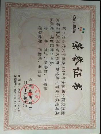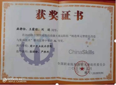 在betway西汉姆联官网领导和老师的关心、帮助及支持下,在校期间,麻静怡同学积极参加校内外组织的各种有益活动和素质拓展,由于表现突出,受到了师生的一致好评;麻静怡同学学习刻苦努力,善于专研,2019年5月,麻静怡同学积极参加全国职业技能大赛河南选拔赛“制造单元智能化改造与集成技术”项目,荣获团队二等奖,并代表河南省参加全国职业技能大赛,在比赛中,麻静怡同学发挥出色,和团队成员获得了全国三等奖的优异成绩。