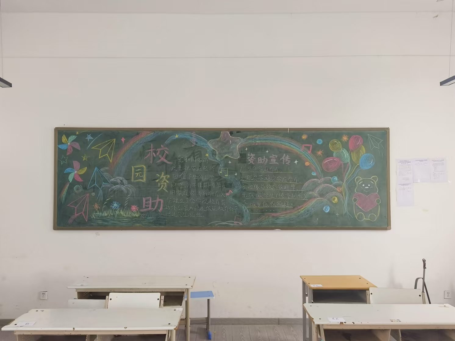 活动伊始,学院下达通知后,各个班级迅速响应,同学们热情高涨,纷纷组队投入到黑板报的创作当中。大家充分发挥自身的创意与才华,紧紧围绕“校园资助”这一核心主题大展身手。有的详细阐释国家助学金的申请流程、精准解读资助标准,有的鲜活展现了励志成才的优秀受助生感人事迹,内容既全面又丰富,形式更是不拘一格。在整个创作进程中,同学们全身心投入,他们不仅对资助政策的理解愈发深刻,更是真切地感受到国家与学校在他们成长道路上给予的温暖关怀。