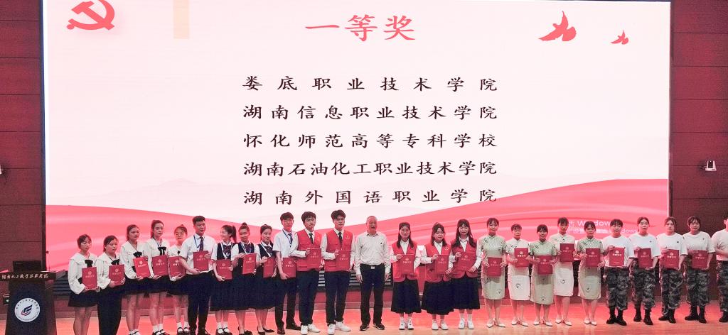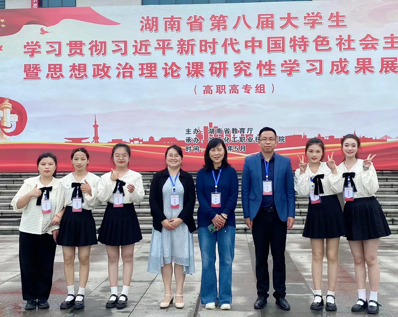 本网讯 5月29日,由湖南省教育厅主办的湖南省大学生学习贯彻习近平新时代中国特色社会主义思想暨第八届思想政治理论课研究性学习成果展示竞赛在湖南化工职业技术学院举行。马克思主义学院院长姚霞带队,由伟德官网马克思主义学院教师陈钧芩、陈辉指导,2020级工业分析1班学生江晓灵等五名同学组成的研究性学习小组,以《牢记嘱托,逐“绿”而“新”—— “三高四新”战略背景下,绿企创建助力 石化学子成材》为主题进行了精彩展示,并荣获一等奖。谢畅、郭丽荣指导的跨境32002班童钎钎等五位同学的《忧乐精神“蕴深意”,石化学子“显担当”》荣获省三等奖。