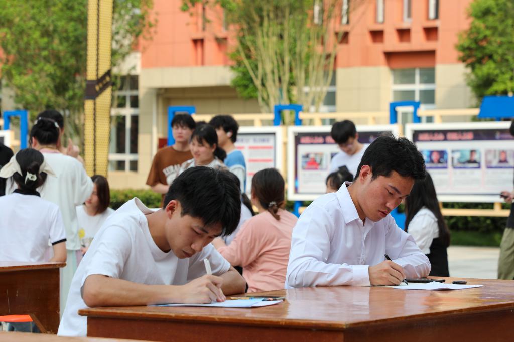 书写展演的同学们恣意挥洒笔墨丹心。而一旁在师生欢声笑语中进行的是紧张有趣的文化文学知识竞赛。参与者在现场抽取有关传统文化、经典名著、党章党史等竞答题目,大家情绪高涨,踊跃抢答。青年语文教师向莎莎老师适时给予文化知识讲解,学生秉神聆听,现场气氛热烈又充满雅韵。学生卢德权捧着印有学校徽章的文创产品奖品说:“这个活动非常有趣,这个奖品我要好好珍藏,我又一次加深了对文化文学知识的了解,经典著作值得我们用心去品读。”
