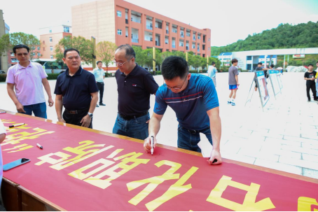 ▲张彦宇(右一)与师生一起签名作出庄严承诺