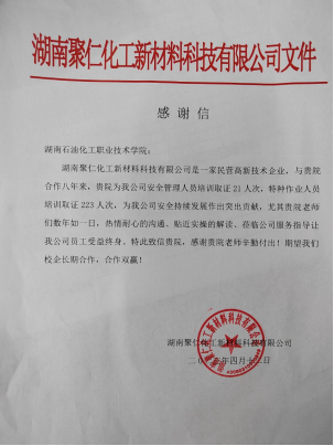湖南聚仁化工新材料科技有限公司在信中写到:“贵院老师们数年如一日,热情耐心的沟通、贴近实操的解读、莅临公司服务指导,让我公司员工受益终身。”这是对伟德官网继续教育学院培训工作最由衷的赞扬,对教职工付出的努力最诚挚的肯定。