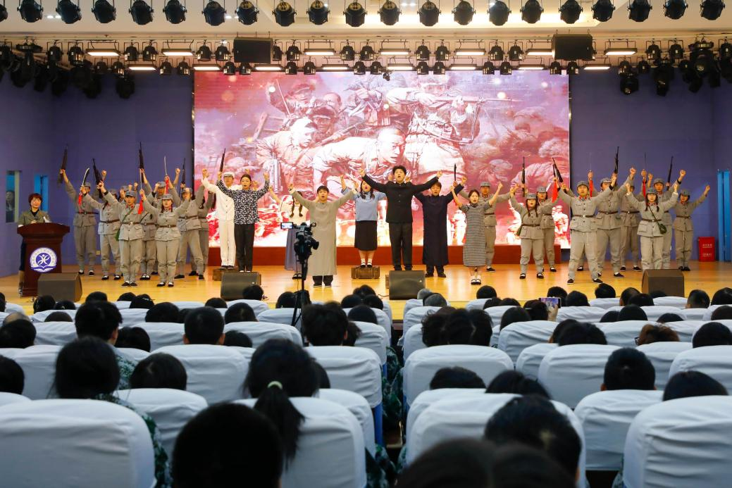 《松花江上》的演绎,将流亡者的悲痛与不屈刻画得淋漓尽致;当《义勇军进行曲》的旋律奏响,全场师生自发起立,高唱国歌,仿佛重回那个万众一心、共赴国难的年代;《游击队之歌》充满了革命的朝气与智慧;《太行山上》的男声大合唱气势恢宏,展现了八路军的英雄气概;《黄河颂》深情演唱不仅赞颂了黄河的壮丽山河,更发出了对民族精神的深情呼唤;一曲《保卫黄河》将现场气氛推向了顶点,表演以一声充满力量的领唱为号角,“风在吼,马在叫”的激昂曲调瞬间响彻全场,激荡着每一位在场者的心弦。一个特别的环节让所有人印象深刻——在讲到抗战胜利时,徐方即兴提议并带领全场师生合唱了我们都熟悉的“拜年神曲”《恭喜恭喜》。她解读了创作者陈歌辛的手记,揭示了这首歌的真正内涵:“恭喜二字,是3500万同胞用血泪换来的劫后余生。”那一刻,熟悉的旋律被赋予了千钧之重,巨大的情感冲击力让许多师生热泪盈眶。