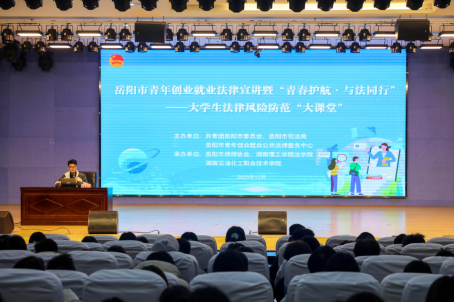 本网讯  为深入贯彻习近平法治思想和习近平总书记关于青年工作的重要思想,全面落实“八五”普法规划要求,切实增强青年大学生的法治意识与风险防范能力,12月12日下午,岳阳市青年创业就业法律宣讲暨“青春护航·与法同行”——大学生法律风险防范“大课堂”活动走进伟德官网。300余名学生代表在学术报告厅沉浸式学习法律知识,筑牢成长法治防线。