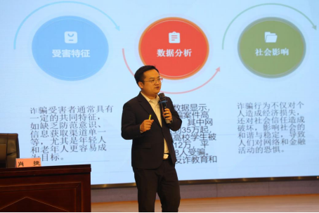 随后,市律师行业团委副书记、岳阳市律师协会青工委主任、湖南金州(岳阳)律师事务所执行主任肖捷律师带来《火眼金睛识诈骗:大学生反电诈安全指南》专题讲座。针对大学生群体涉世未深、防范意识较弱的特点,肖律师梳理了校园贷、网络刷单、虚假招聘等常见电信诈骗类型,通过生动的案例还原诈骗分子的作案手法,总结了“不轻信、不透露、不转账”的反电诈核心原则。在互动问答环节,现场听众踊跃参与,与肖律师热烈讨论,在交流中进一步加深了对电信诈骗的认知,提升了风险防范能力。