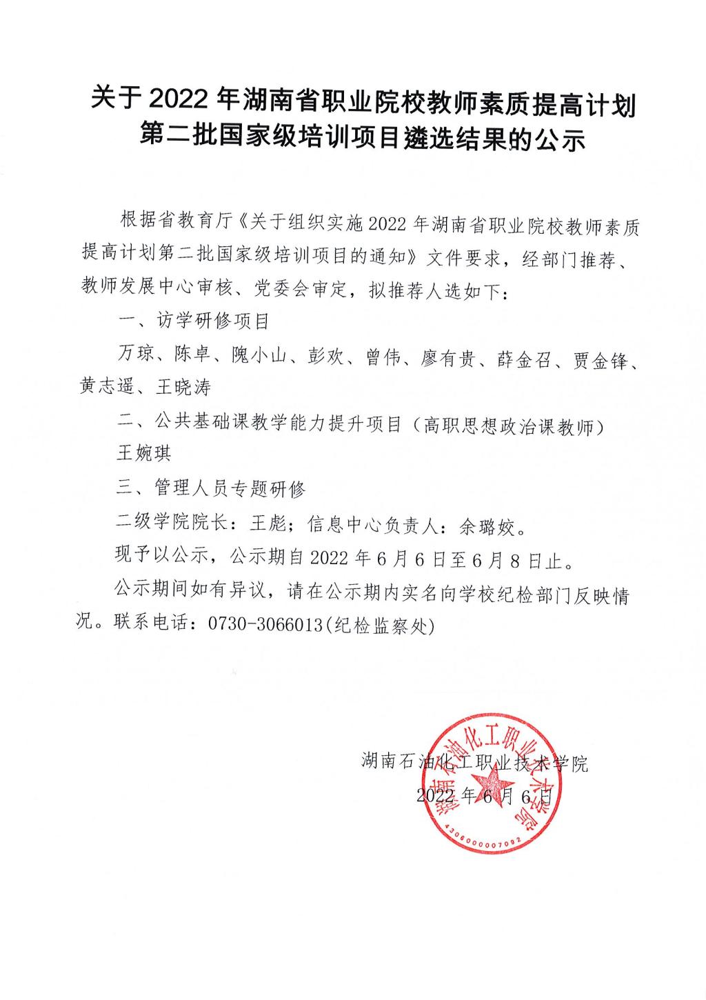 关于2022年湖南省职业院校教师素质提高计划第二批国家级培训项目遴选结果的公示