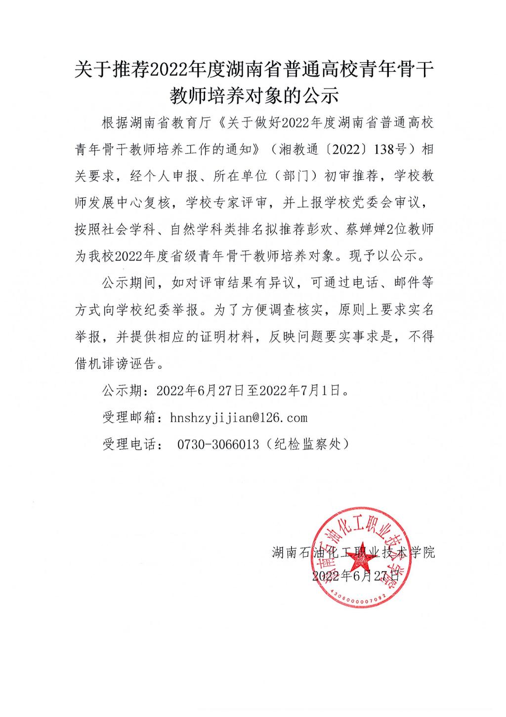 关于推荐2022年度湖南省普通高校青年骨干教师培养对象的公示