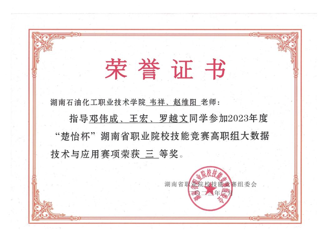 今天在长沙职业技术学院举行的2023年度“楚怡杯”湖南省职业院校技能竞赛高职组“大数据技术与应用”赛项中,胥胜林、韦祥老师指导的学生金超群、肖俊、曹俊荣获团体三等奖。韦祥、赵维阳老师指导的学生邓伟成、王宏、罗越文荣获团体三等奖。