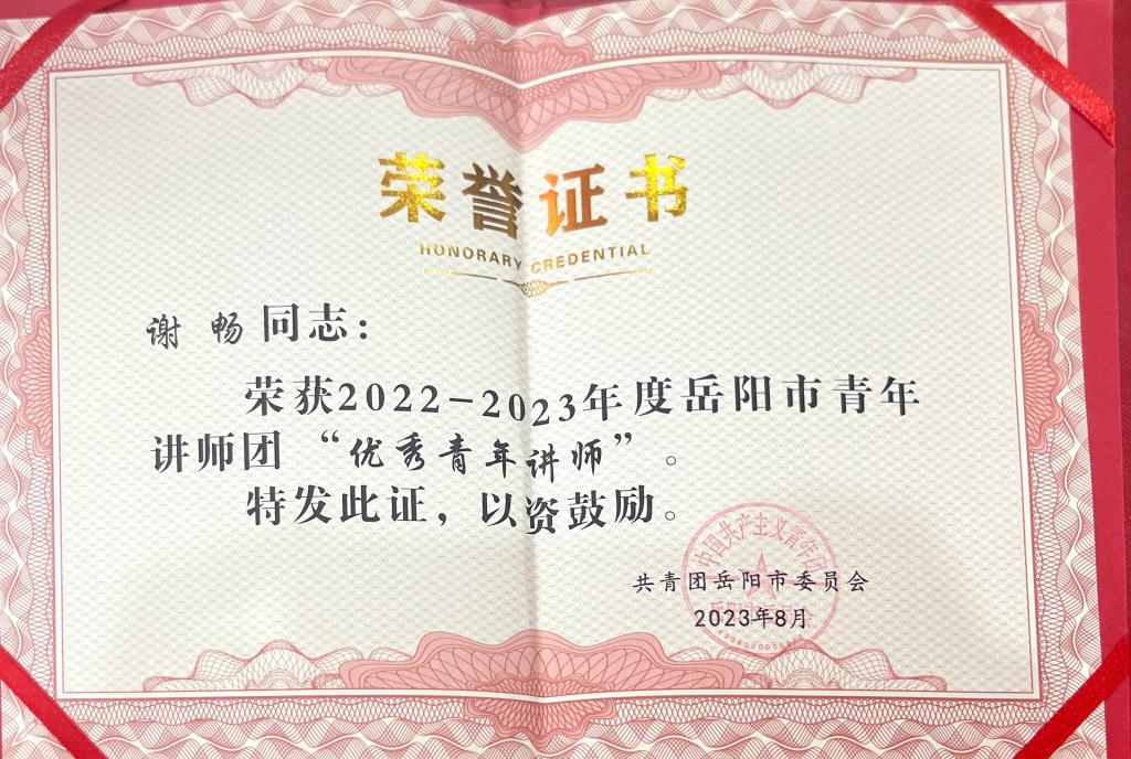 8月25日上午,岳阳市“与理有岳·青春心向党”习近平新时代中国特色社会主义思想青年读书会暨市青年讲师团工作推进会举行。会议表彰了2022—2023年度岳阳共青团“优秀青年讲师”“网络最受欢迎青年讲师”等,伟德官网马克思主义学院副院长谢畅荣获2022—2023年度岳阳共青团“优秀青年讲师”。