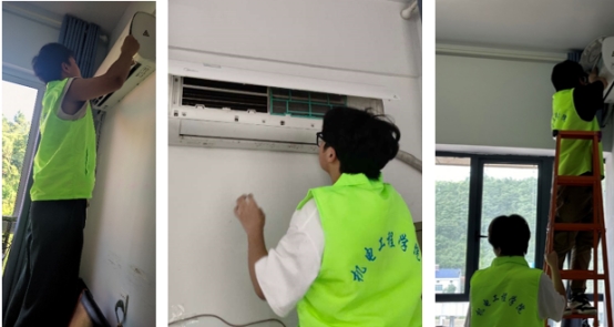 活动前由黄永锋老师对参与者进行安全培训,讲解拆卸步骤与注意事项,此次活动为学生准备了软毛刷与人字梯,空调挂机位置较矮的可以用凳子站立,使用废弃的打印纸垫脚,培养学生环保意识。在分组行动中,有专人对站立的椅子进行扶握并对灰尘入眼进行提醒,有专人对过滤网进行刷洗,全过程都在断电后进行操作。