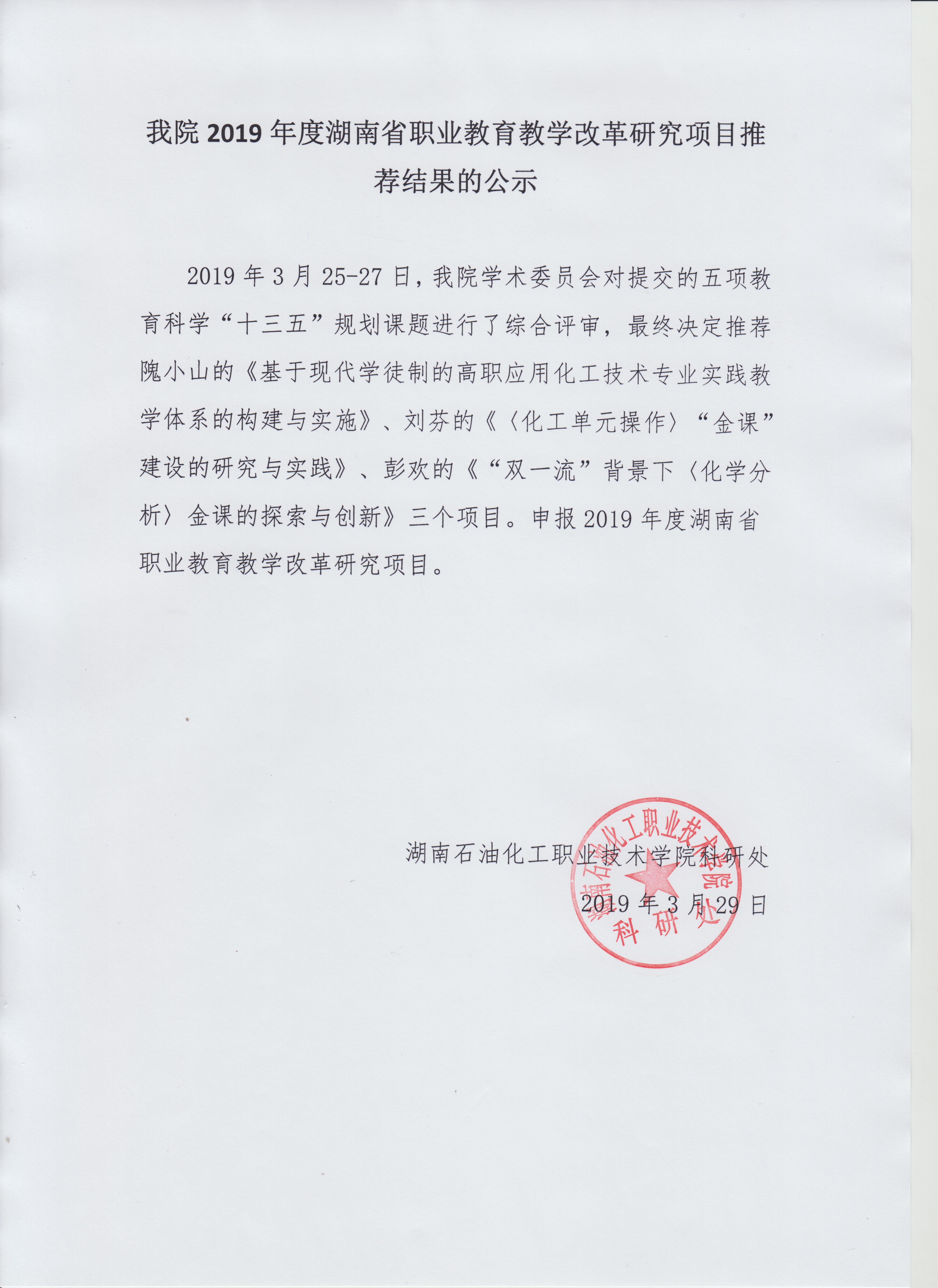 我院2019年度湖南省职业教育教学改革研究项目推荐结果的公示