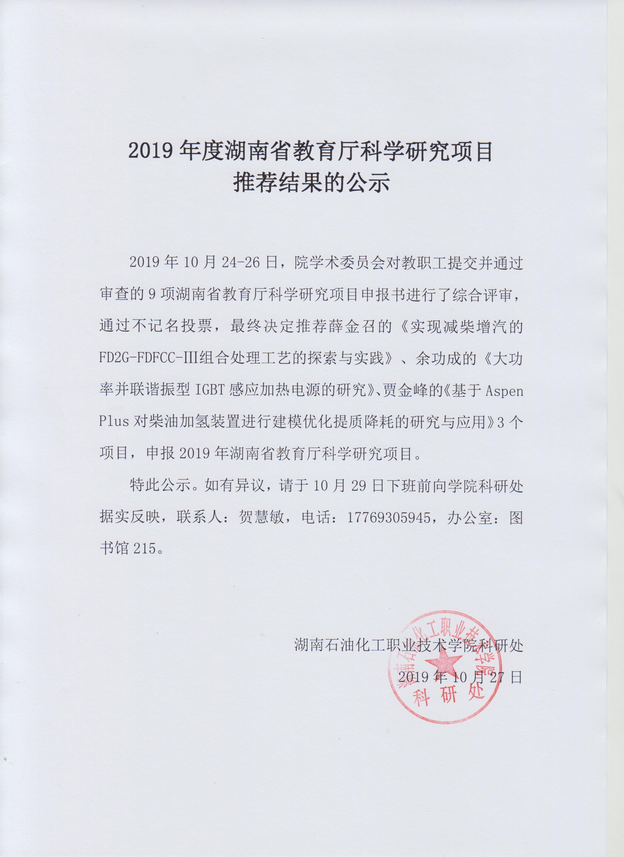 2019年湖南省教育厅科学研究项目推荐结果的公示