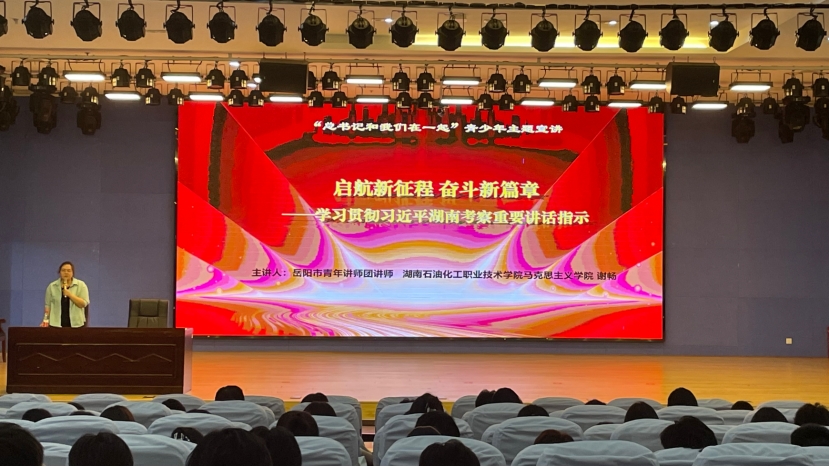 6月17日,为深入学习宣传贯彻习近平总书记考察湖南时的重要讲话和重要指示精神,岳阳市“80 90 00”青年讲师团“总书记和我们在一起”青少年主题宣讲活动在伟德bv国际体育开展。岳阳市青年讲师团讲师、伟德bv国际体育马克思主义学院副院长谢畅面向近400名学生进行了题为《启航新征程 奋斗新篇章—深入学习贯彻习近平总书记考察湖南重要讲话精神》的主题宣讲。此次宣讲旨在引导广大团员和青少年将思想和行动统一到习近平总书记的重要讲话和重要指示精神上来,将力量凝聚到实现习近平总书记对湖南工作的重要指示要求上来。