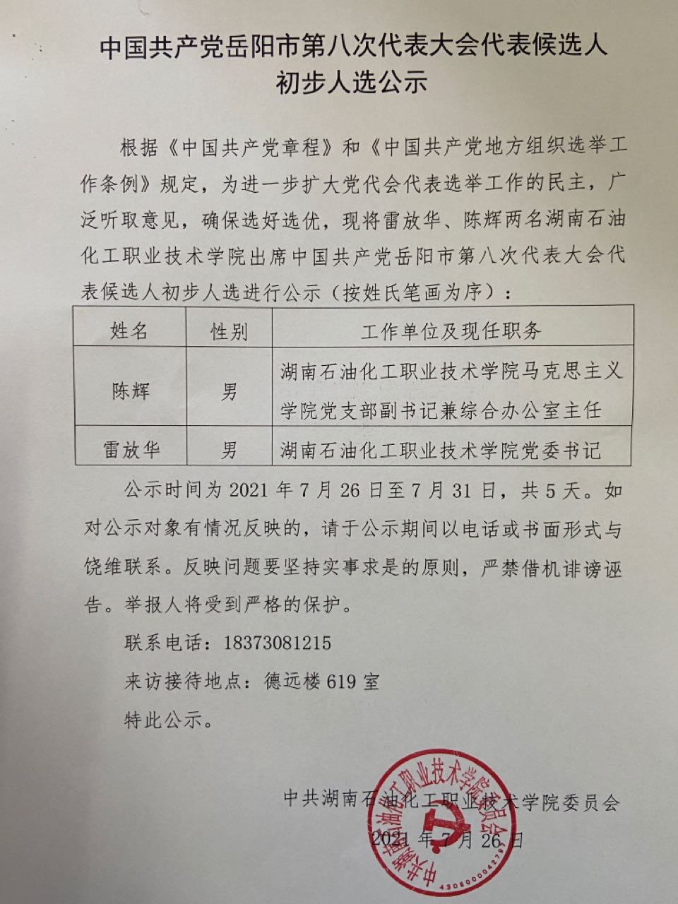 中国共产党岳阳市第八次代表大会代表候选人初步人选公示