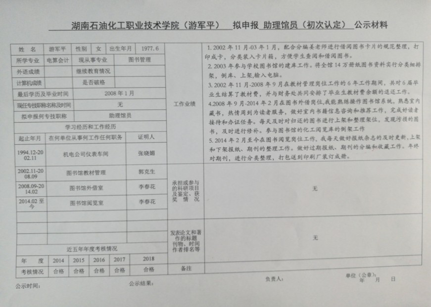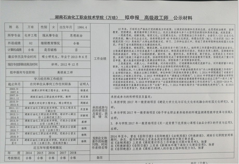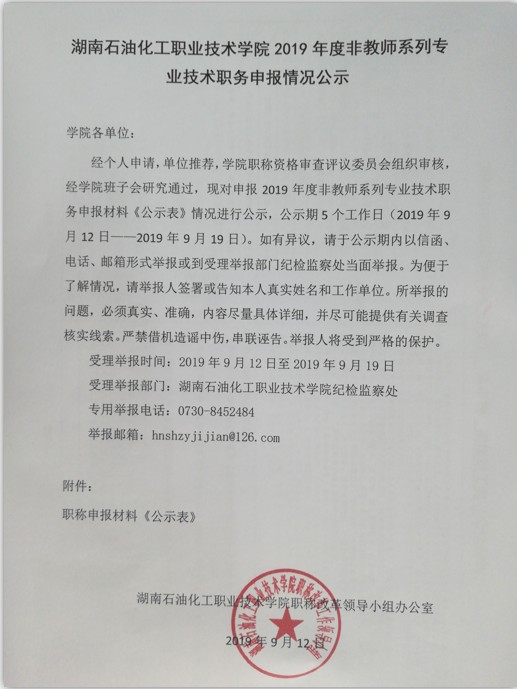 湖南石化职院2019年度非教师系列专业技术职务申报情况公示