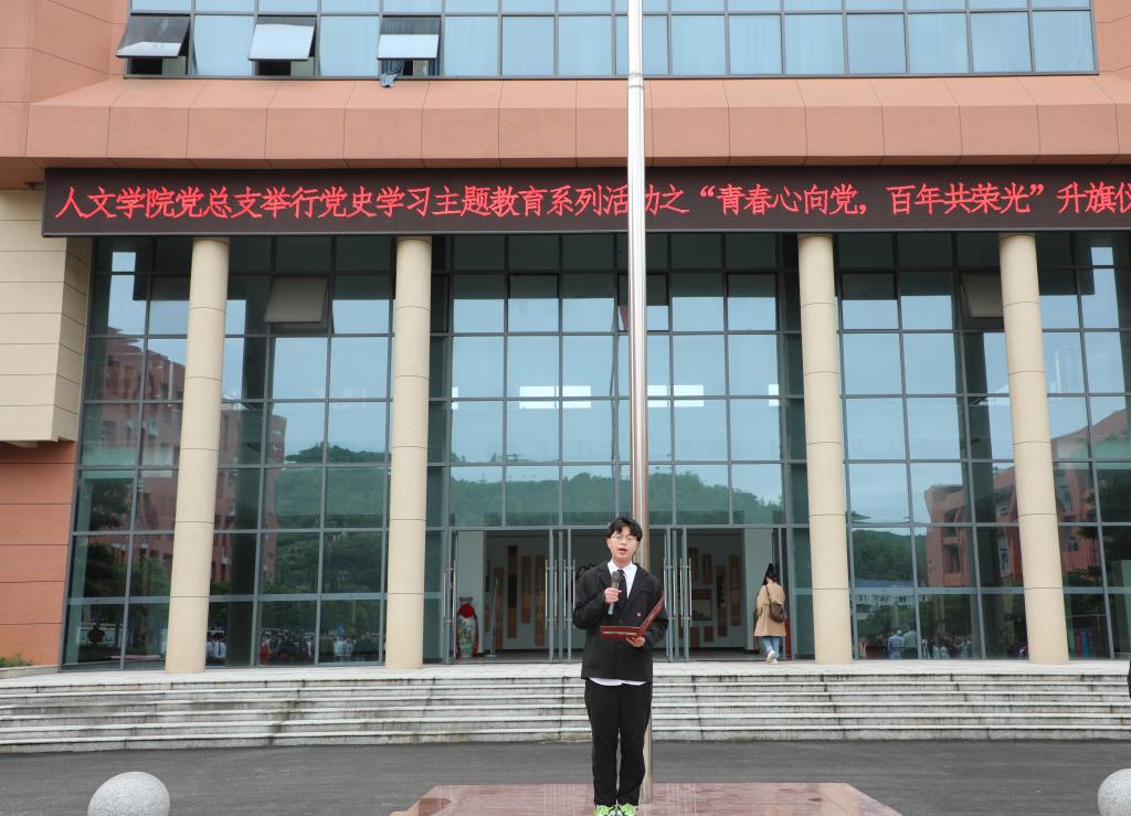 升旗仪式上人文学院党总支书记对全院学生提出了明确要求:全体学生要在今后的学习和生活中,知史爱党,知史爱国,明辨是非,锤炼品德,追求高尚情趣,遵守法纪校规,以优异成绩向中国共产党百年华诞献礼。