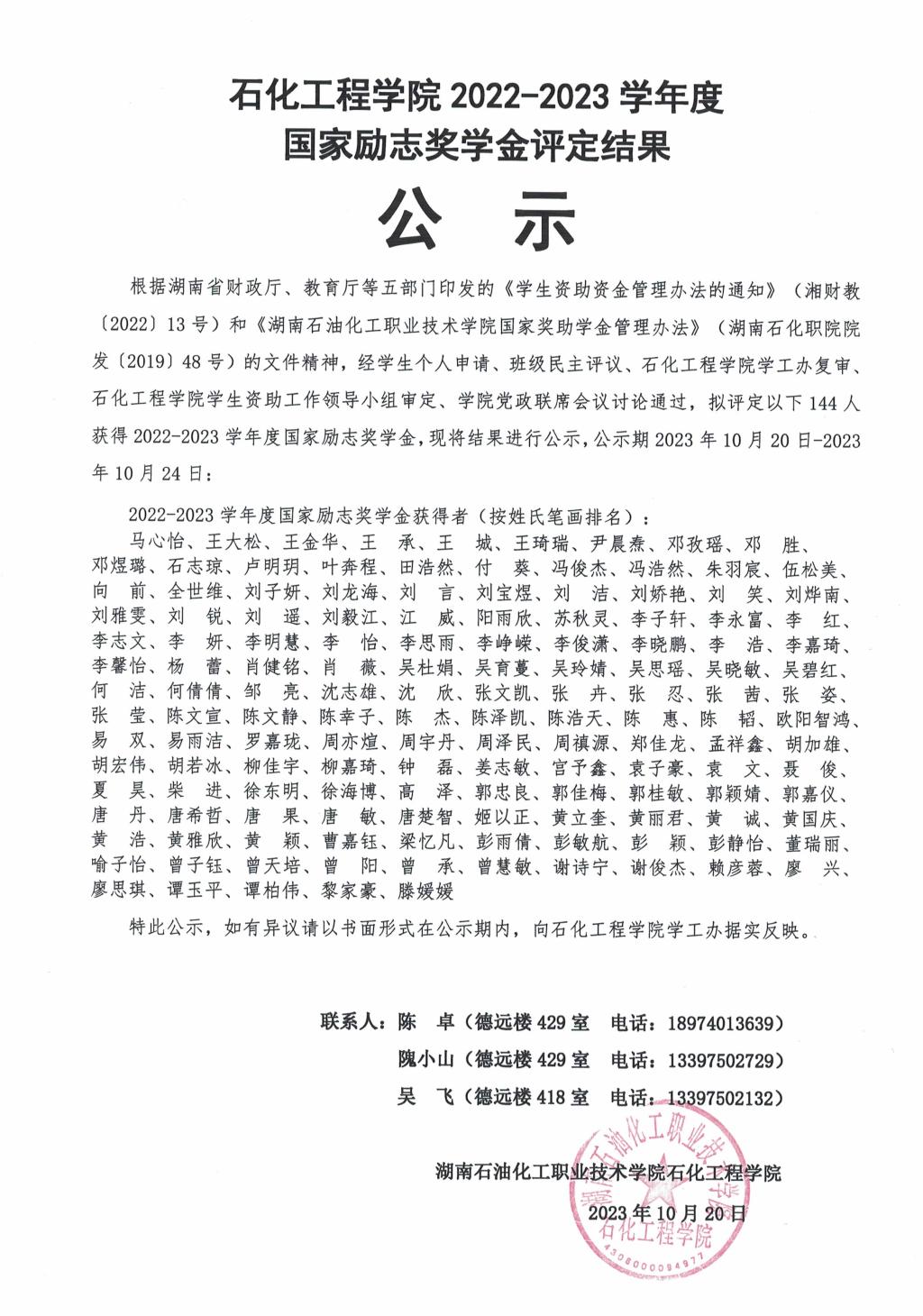 石化工程学院2022-2023学年度国家励志奖学金评定结果公示