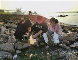 分析教研室老师带领学院环保协会学生现场采集水样。