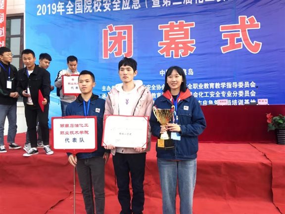 11月5-6日,由中国化学品安全协会、全国安全职业教育教学指导委员会主办的2019年全国院校安全应急(暨第三届化工安全生产)技术技能竞赛在河北省秦皇岛市举行,我院派出了由刘珂、王鑫鹏、王尔豪三位学生组成的代表队,经过两天的激烈角逐,最终以总分第一的成绩斩获团体一等奖,并在典型化工生产事故应急处理仿真操作(A项目)竞赛中夺得单项第一名,王伟,张娟娟两位老师获得“优秀指导教师”称号。