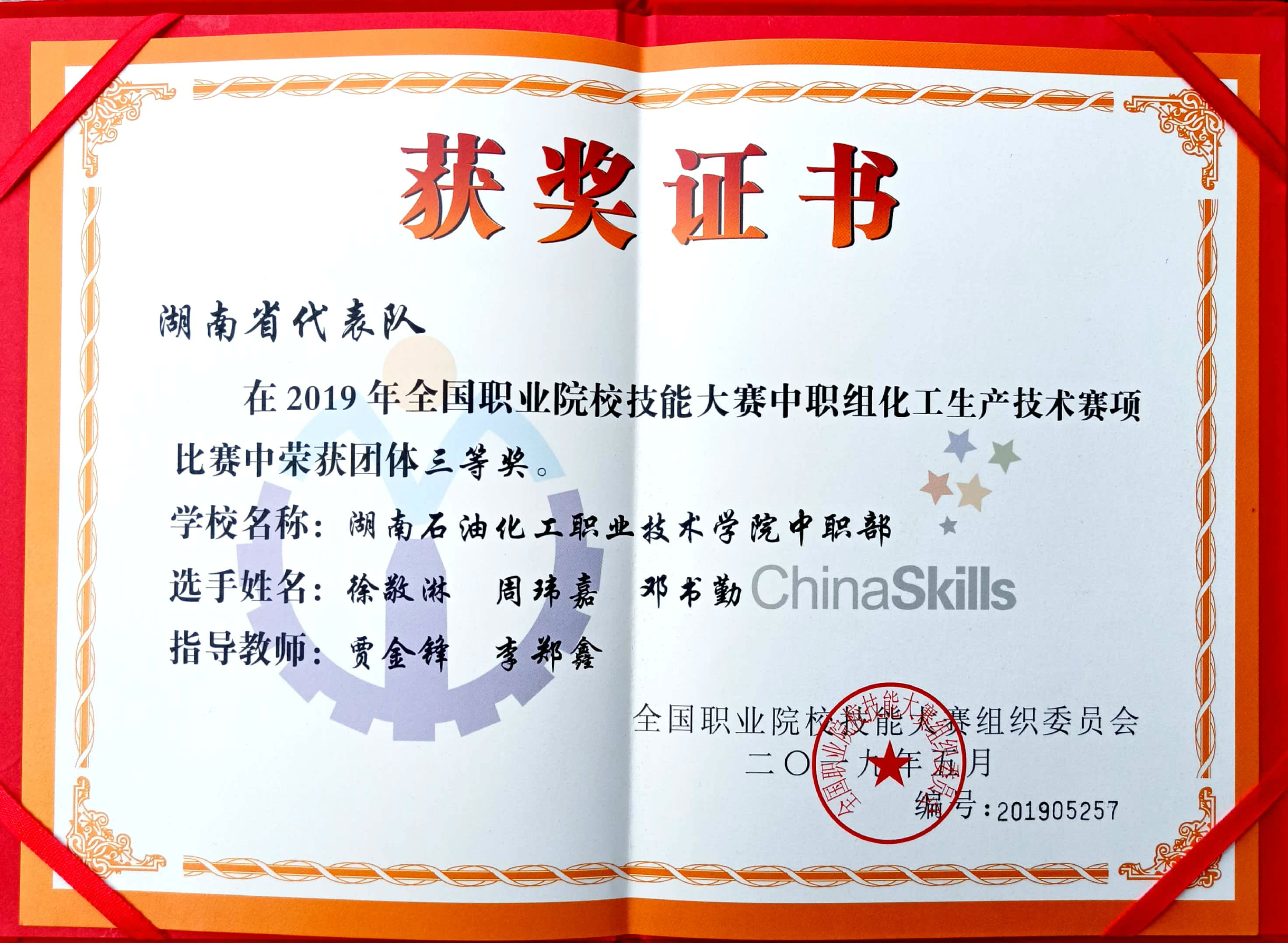 在刚刚落幕的2019年全国职业院校技能大赛(中职组)化工生产技术赛项中,由石化工程学院副院长陈卓带队,贾金锋、李郑鑫老师担任指导老师,石化5163班周玮嘉、徐敬淋,石化5164班邓书勤三位同学组成的学院代表队斩获三等奖!这是伟德官网中职学生首次参加国赛并获得佳绩。