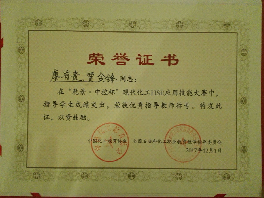我院参赛队由石化技术工程系张争银(石化3163班)、刘莉霞(石化3162班)、李建军(石化3162班)三名学生组成的“科普队”和陈钱(石化3161班)、李彬(石化3164班)、和晓伟(炼油3161班)三名学生组成的“技能队”组成。在廖有贵、贾金锋两位老师的精心指导下,经过赛前的充分准备和反复高强度的训练,经过两天激烈的角逐,我院代表队不负众望,荣获高职现代化工HSE科普知识竞赛团体二等奖和高职现代化工HSE应用技能竞赛团体二等奖;廖有贵、贾金锋两位老师分别荣获“优秀指导教师”荣誉称号。