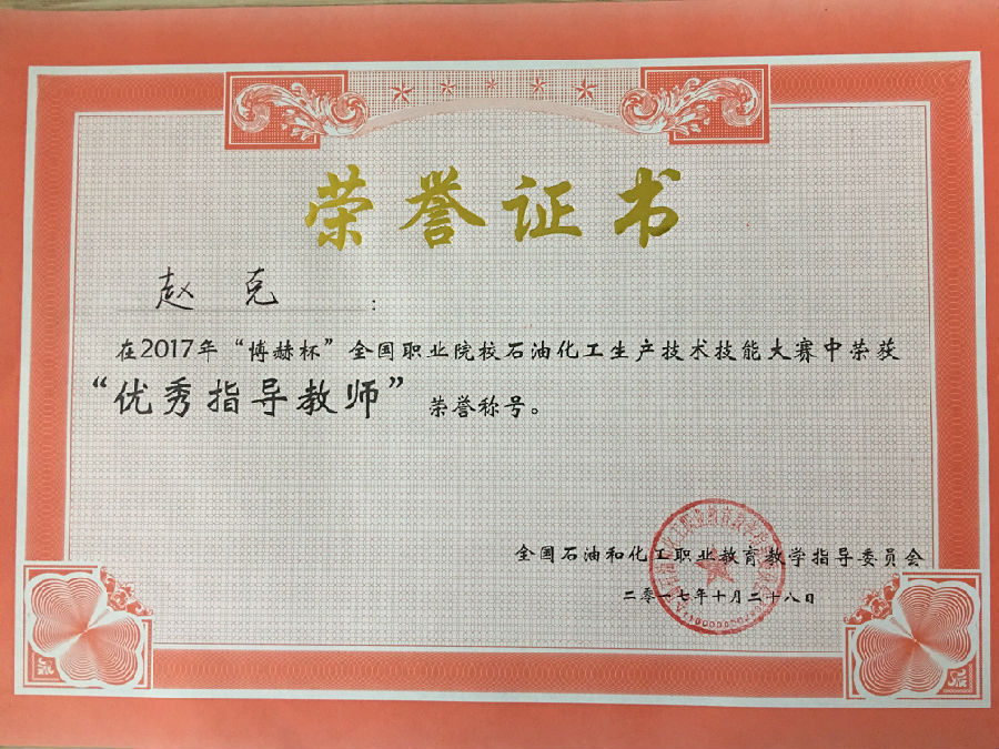 作为我省唯一代表队,我院派出了由三位学生包正文(应化31501班)、王凯(石化3163班)、王义臣(石化3161班)和两位指导教师(赵克、张晓磊)组成的代表队参加了本次比赛,经过三天的激烈比赛,我院代表队最终以总分第二名的成绩荣获2017年“博赫杯”全国职业院校石油化工生产技术技能大赛团体一等奖, 赵克、张晓磊两位老师荣获“优秀指导教师”荣誉称号。