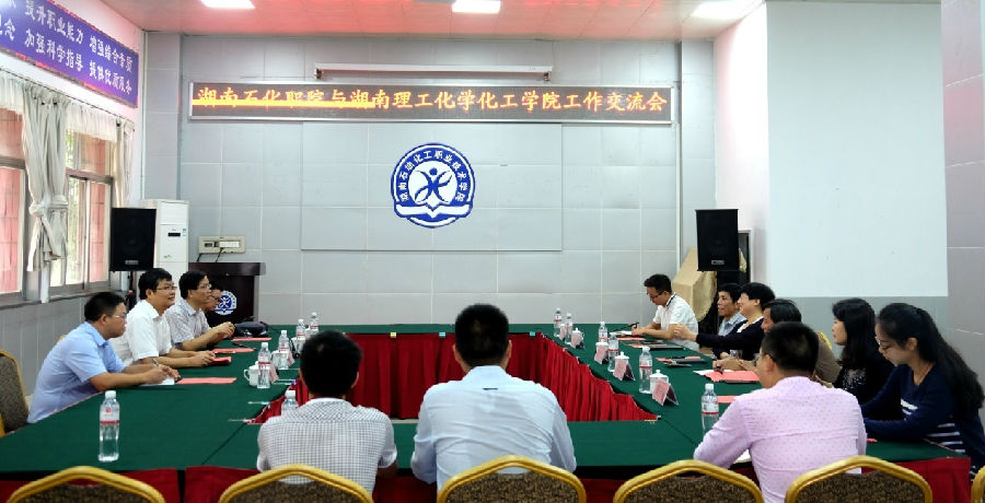 交流会上,符文文对湖南理工学院化学化工学院周从山院长一行的到来表示热烈欢迎,并向来宾们介绍了学院的办学基本情况、职工培训情况,重点介绍了学院的办学特色,并就湖南理工学院多年来对学院的关心和支持表示了感谢。周从山院长介绍了湖南理工学院化学化工学院的基本情况和“十三五”发展愿景,表明了在专升本人才培养、教学科研等方面的合作意向。钟明副院长介绍了湖南理工学院化学化工学院实验室建设、国际交流开展等情况,并表明了与我院共建共享实验实训基地的意向。在进一步的交流和讨论中,双方达成多项共识。
