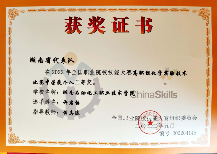 近日,2022年全国职业院校技能大赛赛事活动陆续在全国各大高职院校落下帷幕。在本次国赛上,石化工程学院共有三个赛项代表湖南省参赛并全部获奖,其中“高职组化工生产技术”和“中职组化工生产技术”两个赛项荣获团体二等奖,“高职组化学实验技术”赛项荣获个人三等奖,实现了国赛获奖数量和质量双突破。
