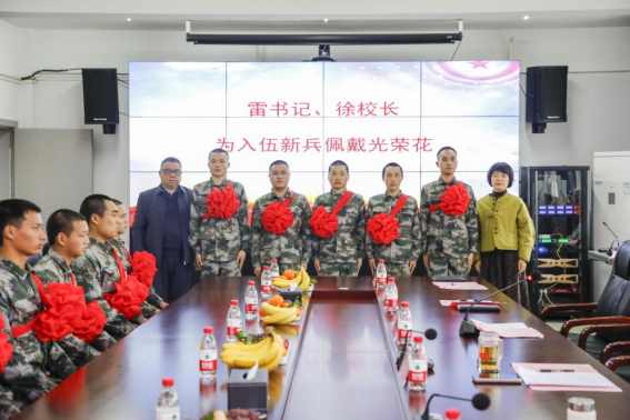 大会宣读了应征入伍的19名同学名单,雷放华、徐方为每一位入伍新兵佩戴光荣花。新兵代表在发言中表示,自己将肩负使命,以优秀军人为榜样,心怀崇高理想,练就过硬本领,为国家强大贡献一份力量。