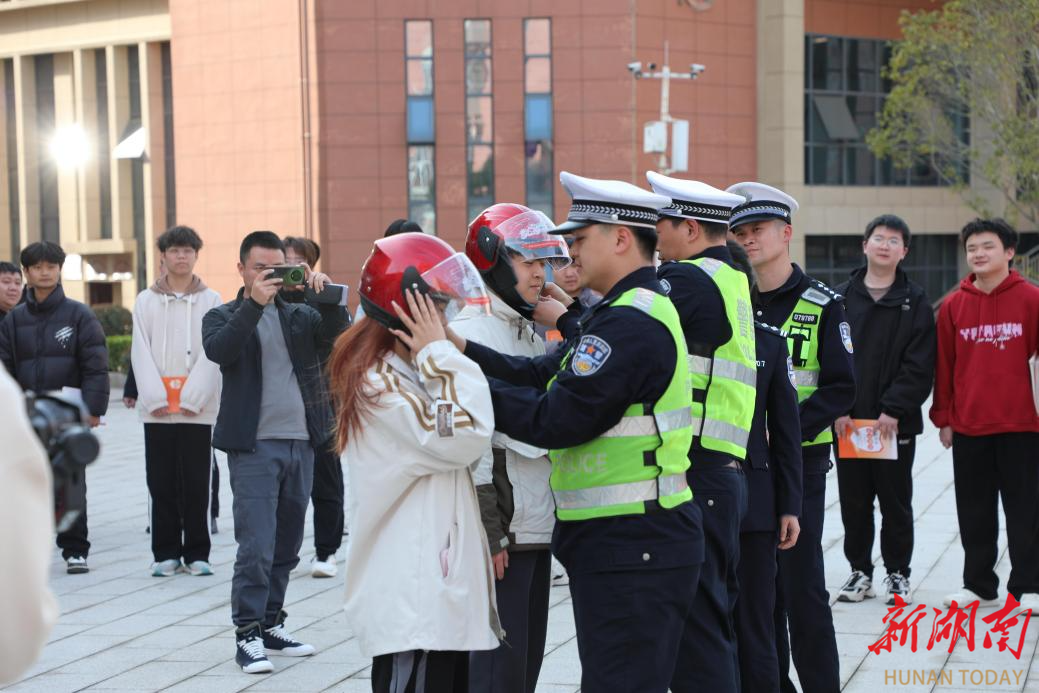 岳阳县交警大队的交警首先组织学生们在教室观看了交通安全事故警示教育片,结合实际事故案例分析未戴头盔、超员超载、闯红灯、不按道行驶等交通违法行为的危害。随后,交警带领学生走出教室,来到学校思源广场为同学们展示各类交通标识符号,并现场示范如何正确选择头盔以及头盔正确佩戴方式。此外,交警们还组织学生现场模拟酒精测试和酒驾查处,由交警扮演机动车驾驶员进行吹气式酒精检测,多名学生现场体验“交警执法”,让学生们真切感受酒后驾车所带来的危害。