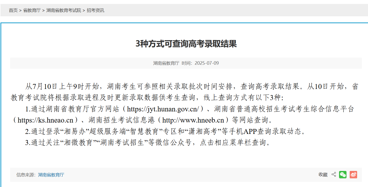 考生也可以按照下方湖南省教育考试院网站文章中提到的方法查询个人录取状态: